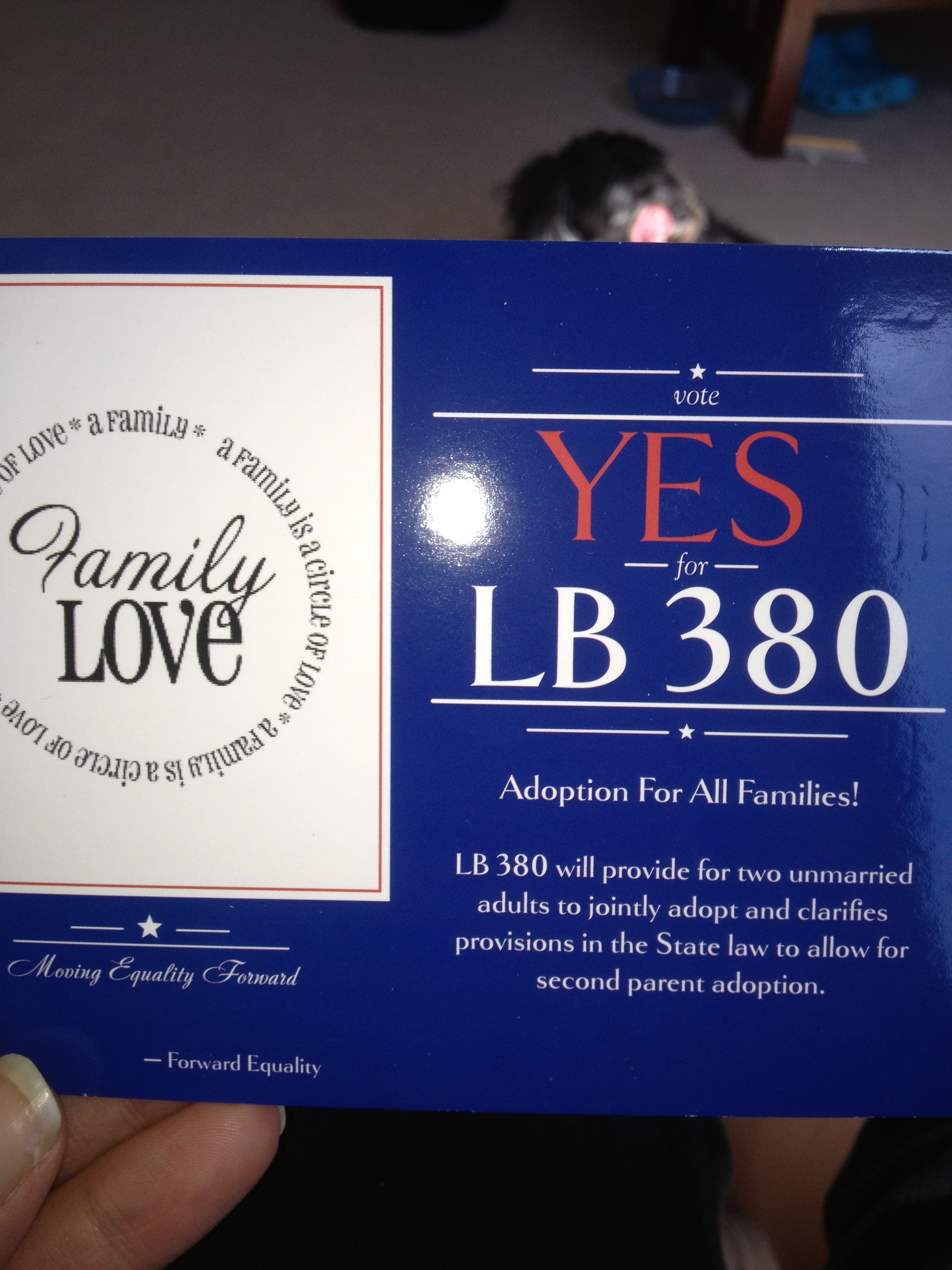 If anyone wants more information on LB 380 or would like to help out with making postcards and having free pizza please go to this page: https://forwardequality.wordpress.com/2013/03/14/tell-the-judiciary-committee-to-support-lb-380/