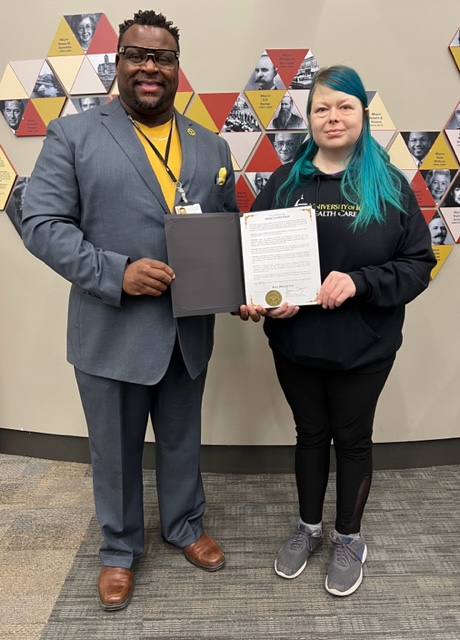 Here is Iowa City Mayor Bruce Teague handing me (Mika) the city proclamation for Rare Disease Day 2024.