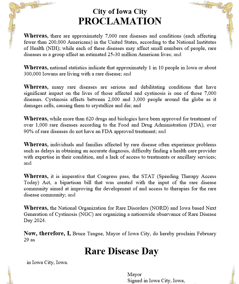 Today was Rare Disease Day, February 29th, 2024. In Iowa City, Iowa we celebrated the day with a proclamation from the city government proclaiming today, February 29th as Rare Disease Day in the city.